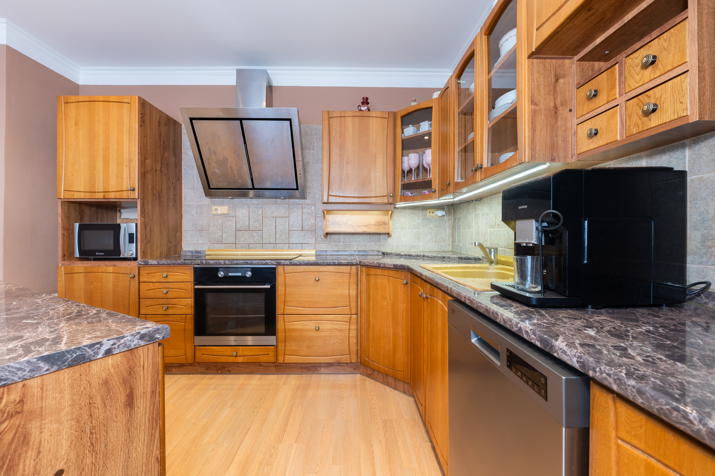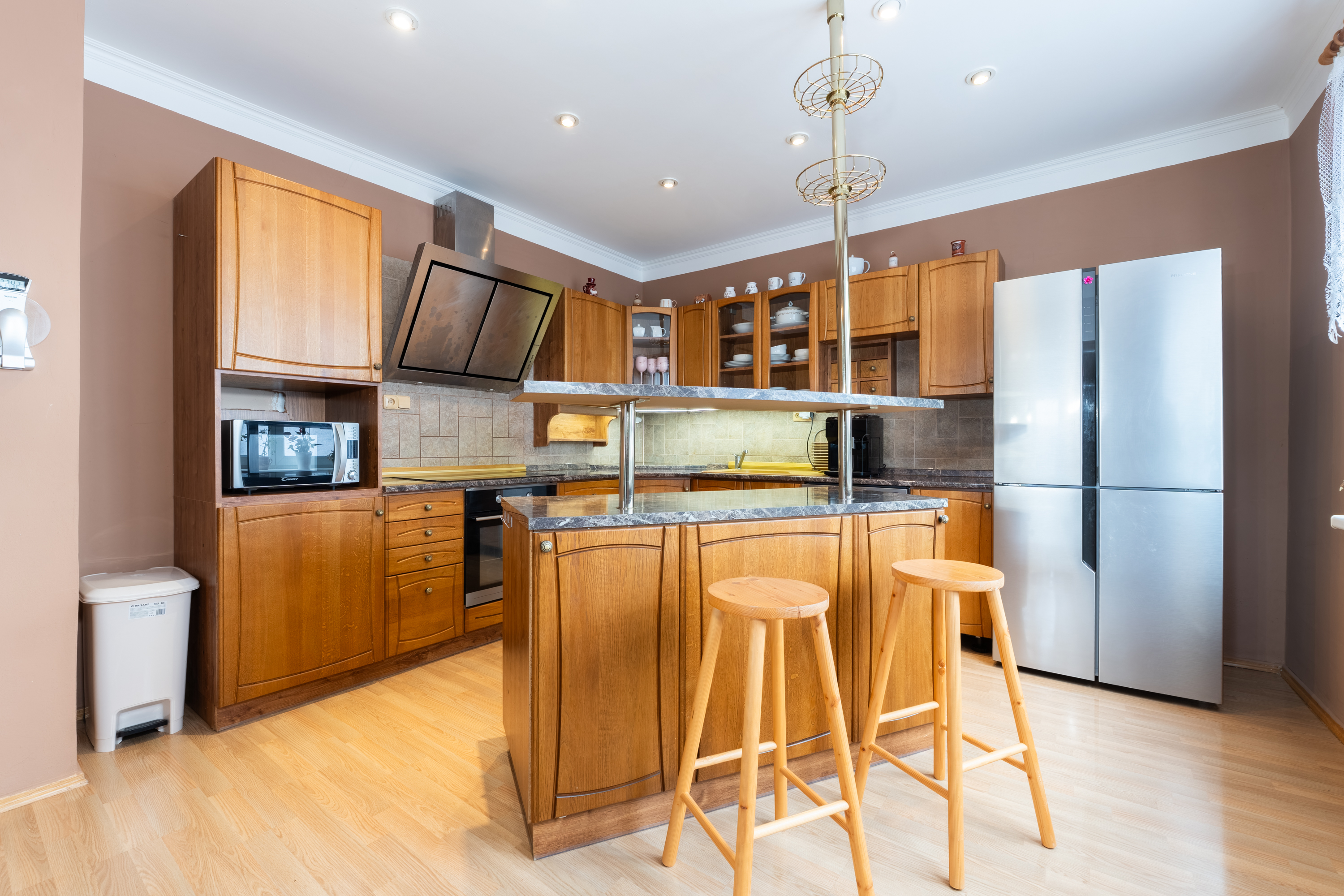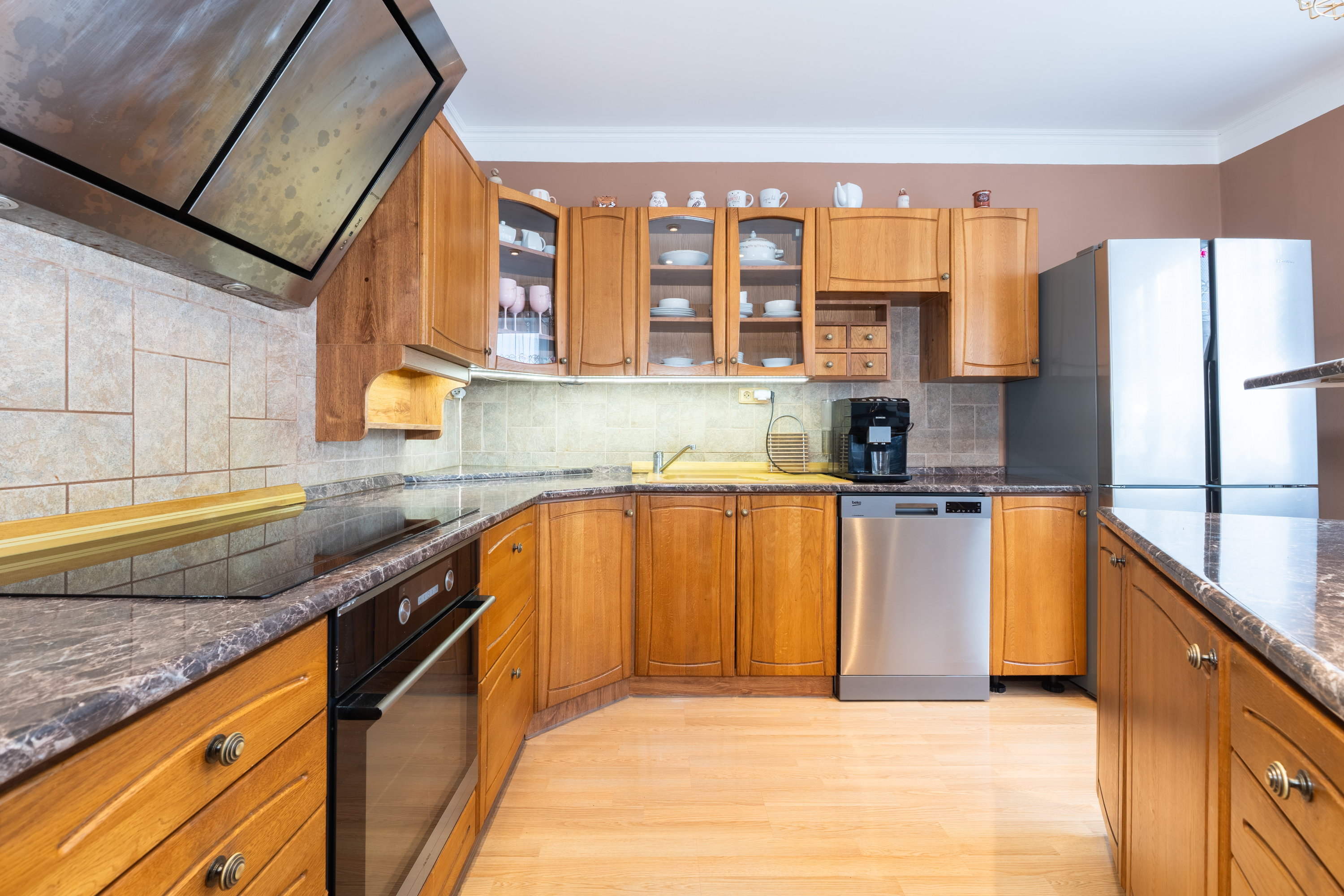 Kuchyně je vyrobena na míru ze dřeva a nabízí dostatek pracovního prostoru. Uprostřed se nachází kuchyňský ostrůvek s velkou indukční varnou deskou.
